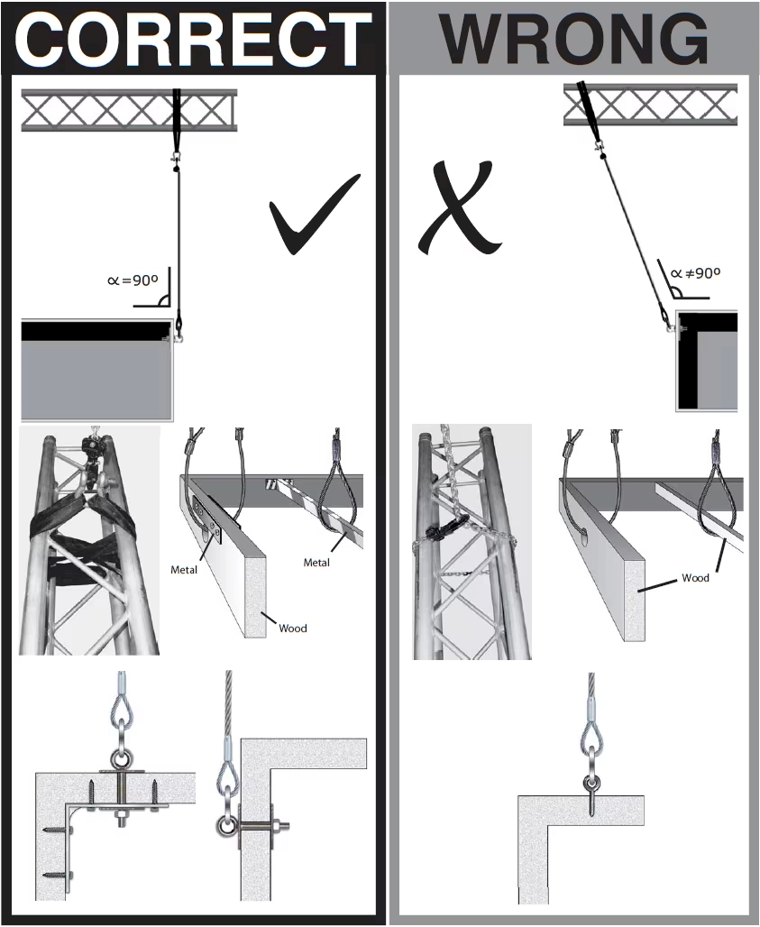 - All rigging must be installed by the official rigging supplier. All suspended fittings and apparatus (e.g., lights, TVs sound clusters and speakers, display rigs etc.) must be fitted with secondary safety wires/chains and brackets